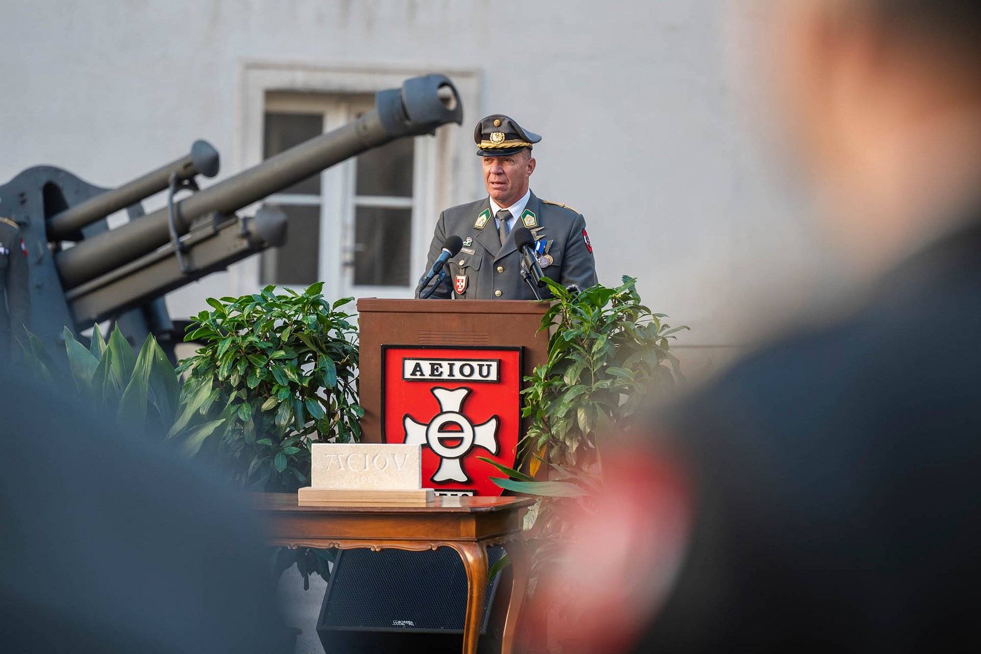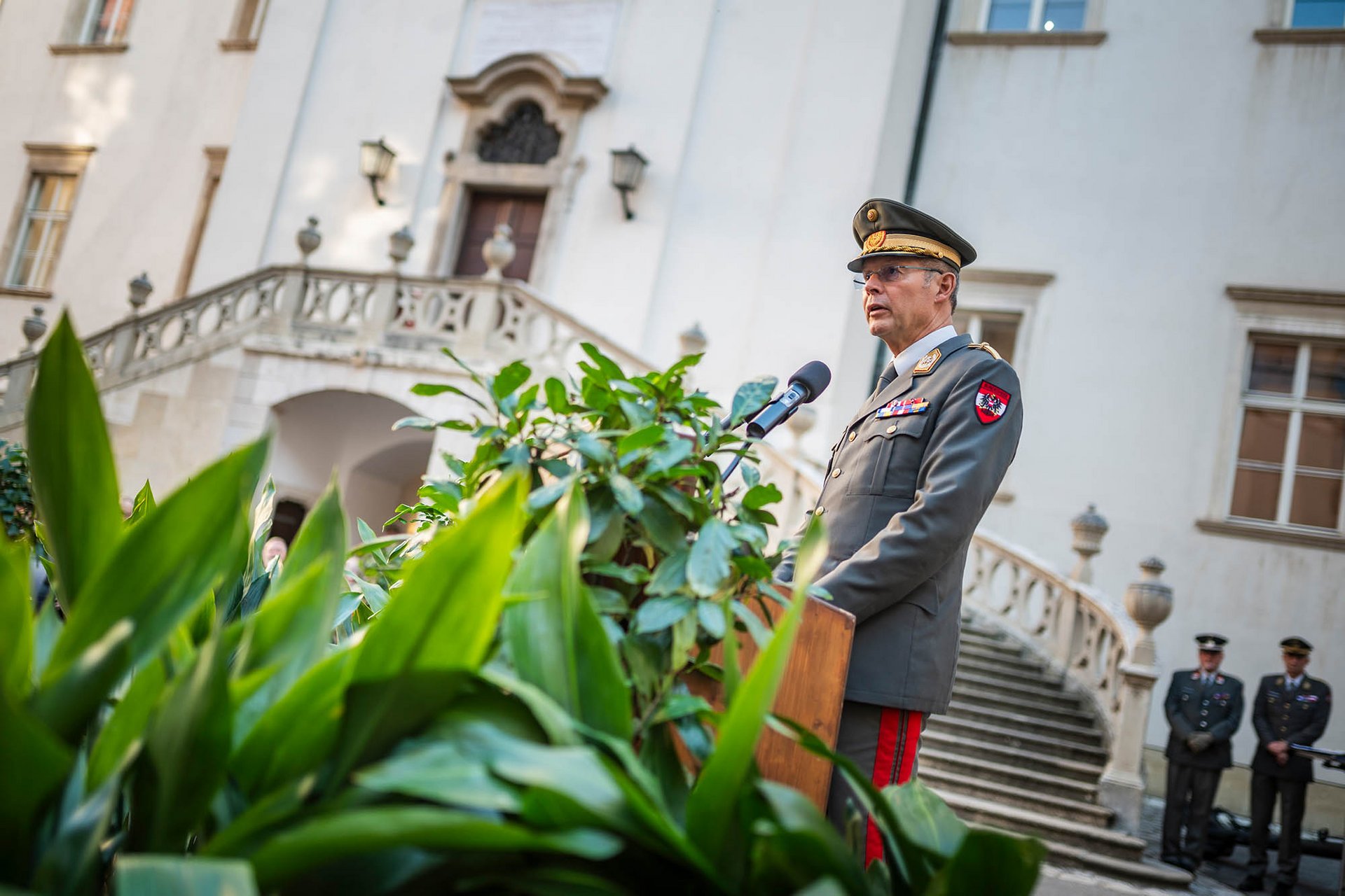 Der neue Kommandant des Akademikerbataillons, Oberst Markus Hornof, drückte am Beginn seiner Rede seine Freude, aber auch seinen Respekt und Demut für die neue Aufgabe aus. “Für mich schließt sich ein Kreis. Als Sohn eines an der Militärakademie lehrenden Offiziers, in der Wohnsiedlung am Campus aufgewachsen, war die Burg schon immer Teil meines Lebens, sowie das Interesse an der Offiziersausbildung. Und so freut es mich nun sehr als Kommandant des Akademikerbataillons wesentlich an dieser Offiziersausbildung mitwirken zu können” so Oberst Hornof.