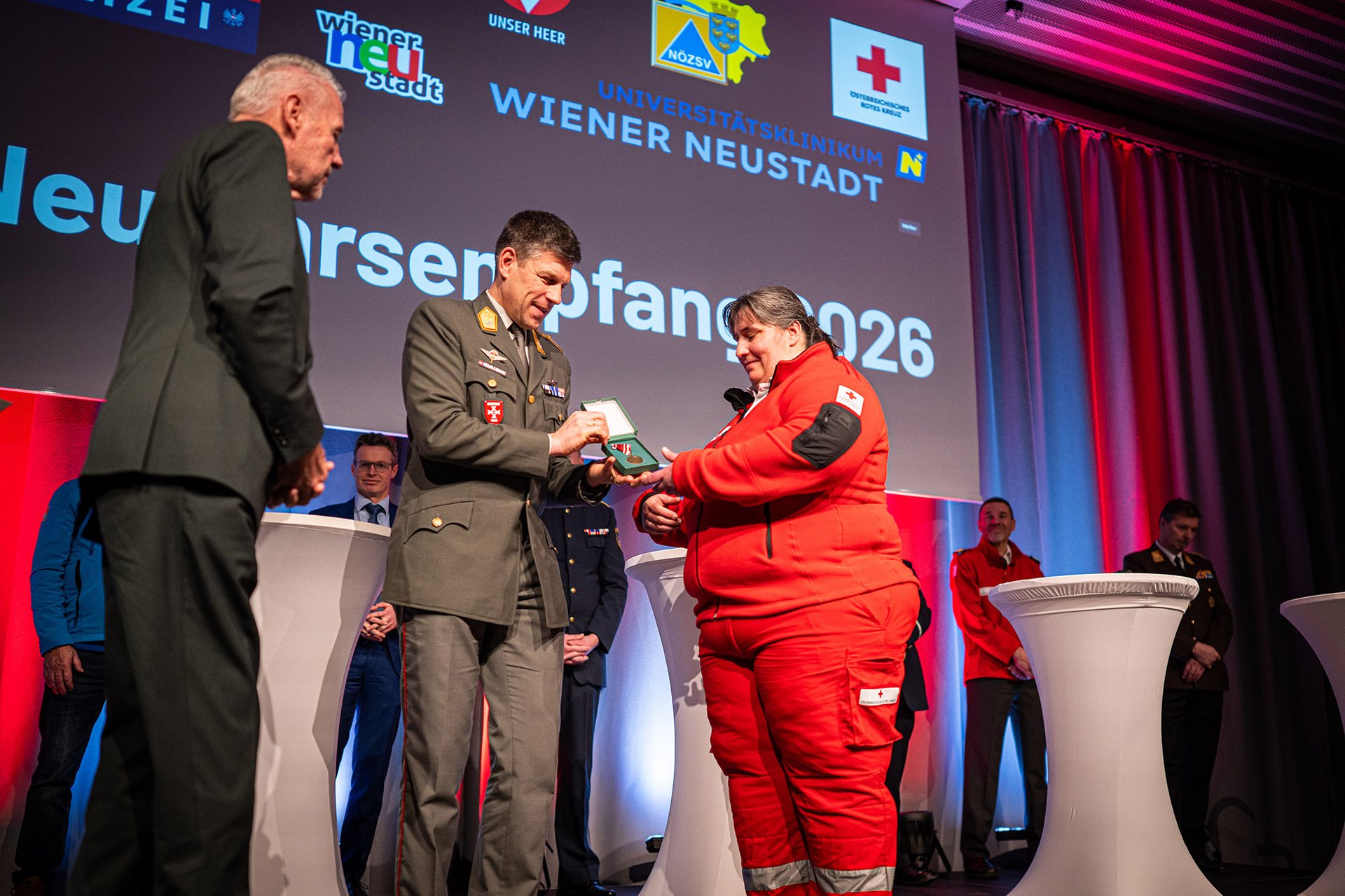 Die Veranstaltung wurde auch genutzt, um einer Personen, die sich um die militärische Landesverteidigung verdient gemacht hat, auszuzeichnen. So überreichte Brigadier Philipp Ségur-Cabanac die, durch die Bundesministerin für Landesverteidigung verliehene, Militär-Anerkennungsmedaille an Frau Martina Kohlhammer, Mitarbeiterin des Roten Kreuzes.