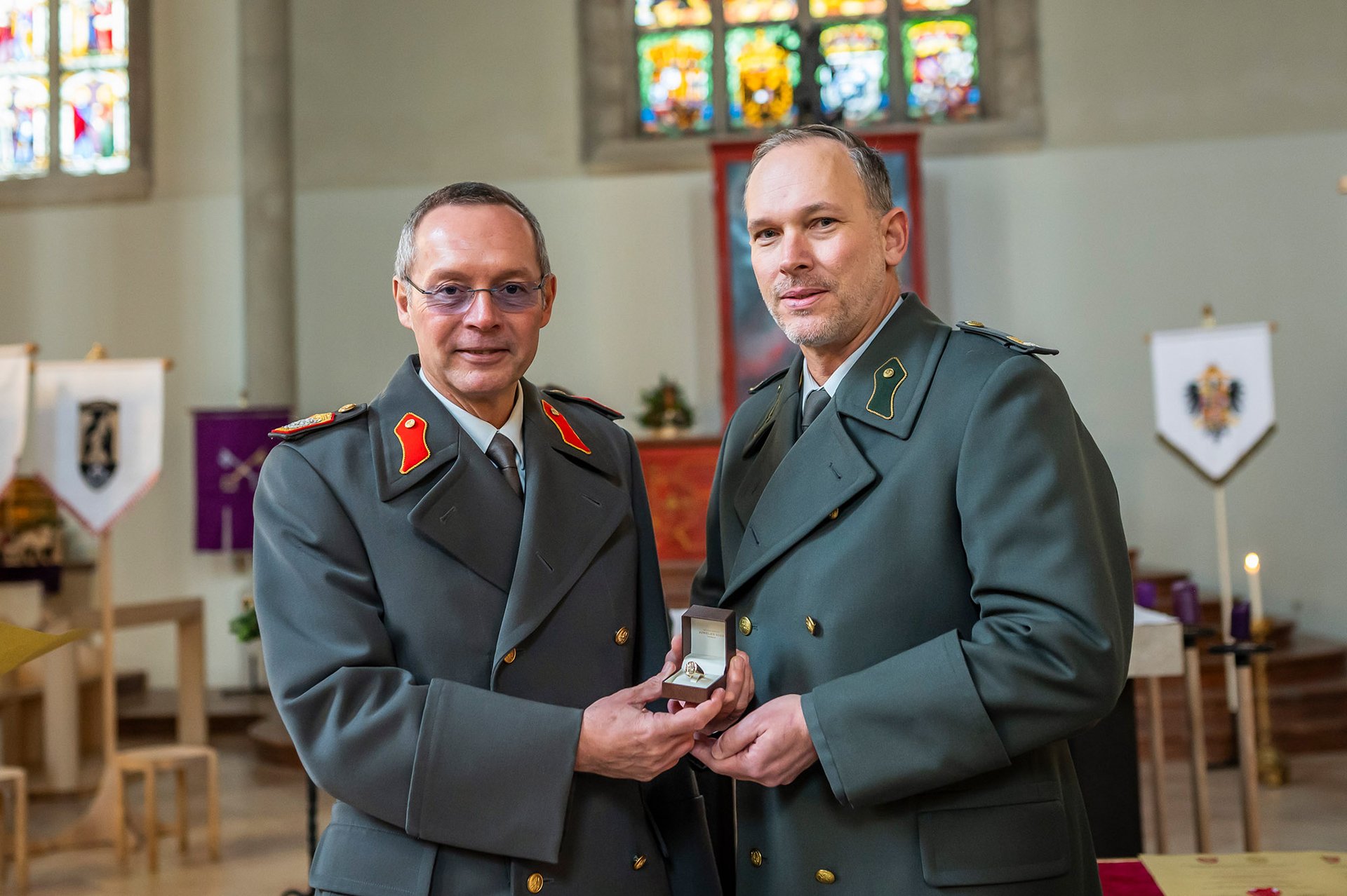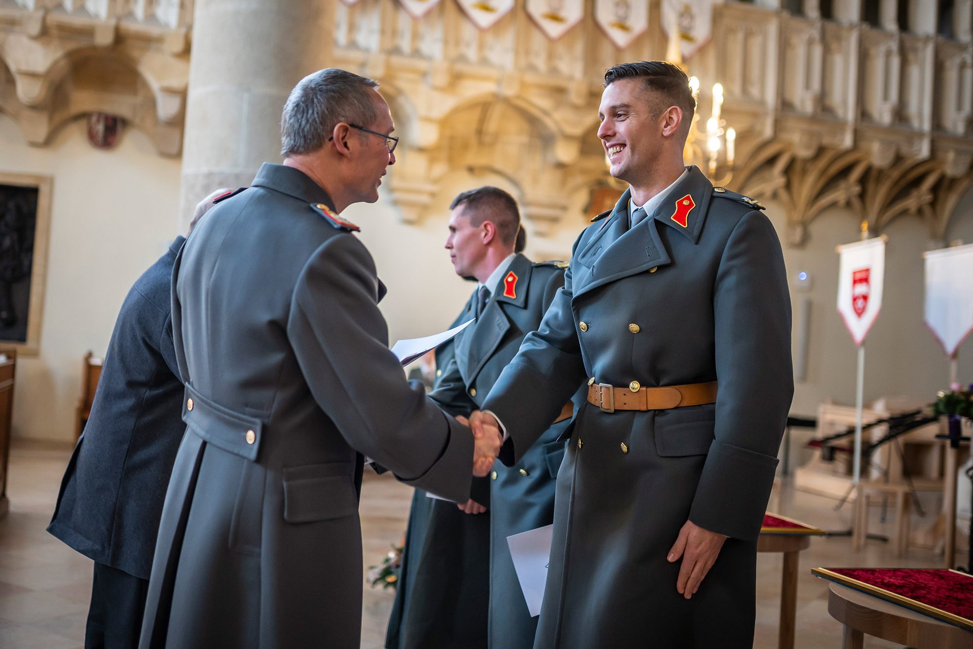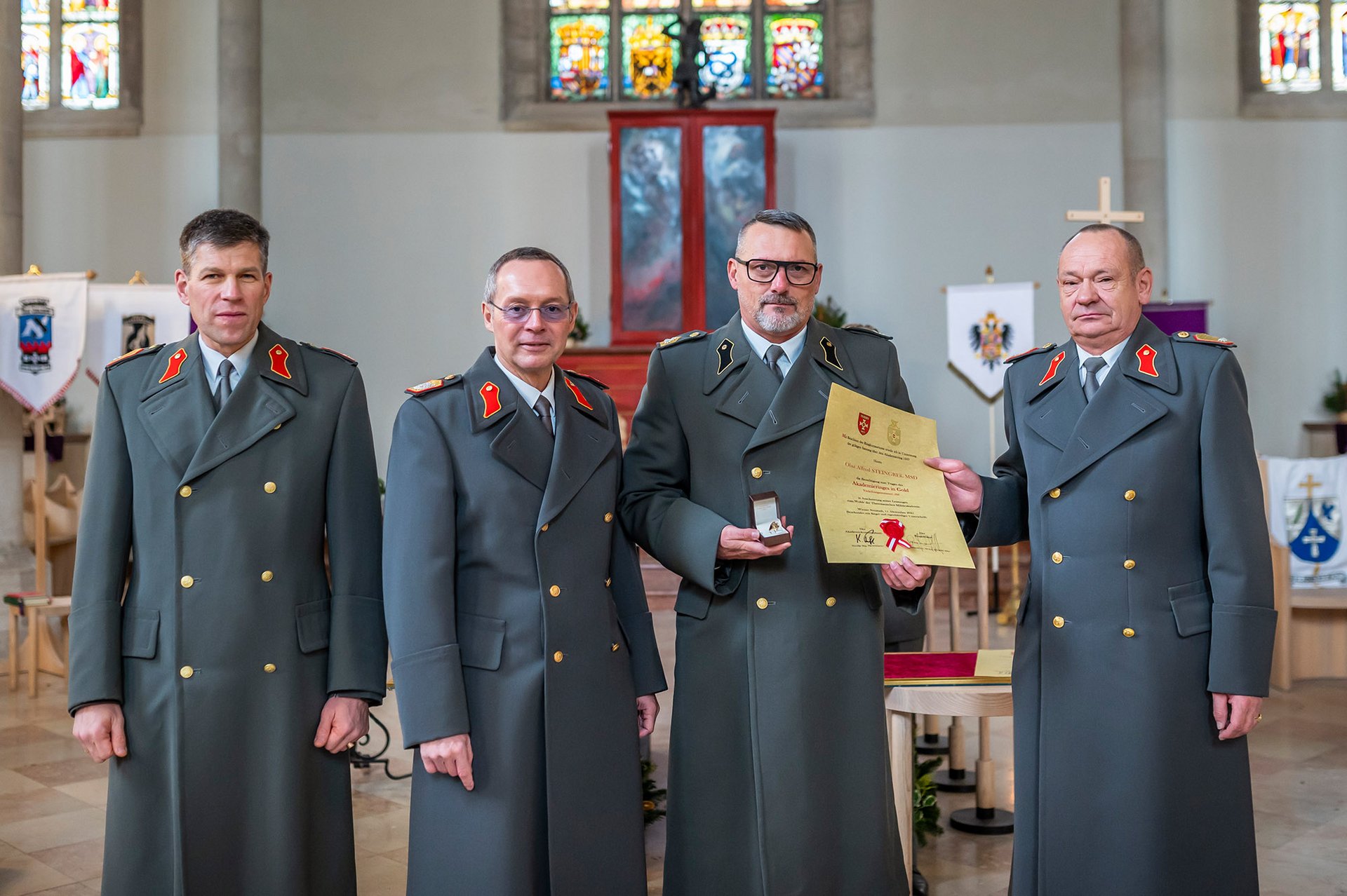 Und so hat auch dieses Jahr dieses Kuratorium über die „Rechtschaffenheit und Tüchtigkeit“ zum mehrjährigen Wohle der Theresianischen Militärakademie mehrerer Kandidaten beraten und entschieden und ist zum Ergebnis gekommen, dass vier Personen der Akademiering in Gold zu verleihen wäre.