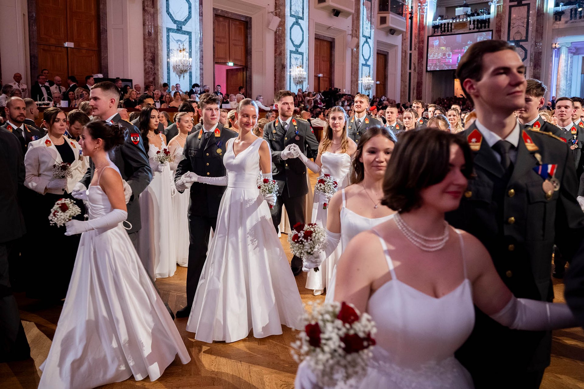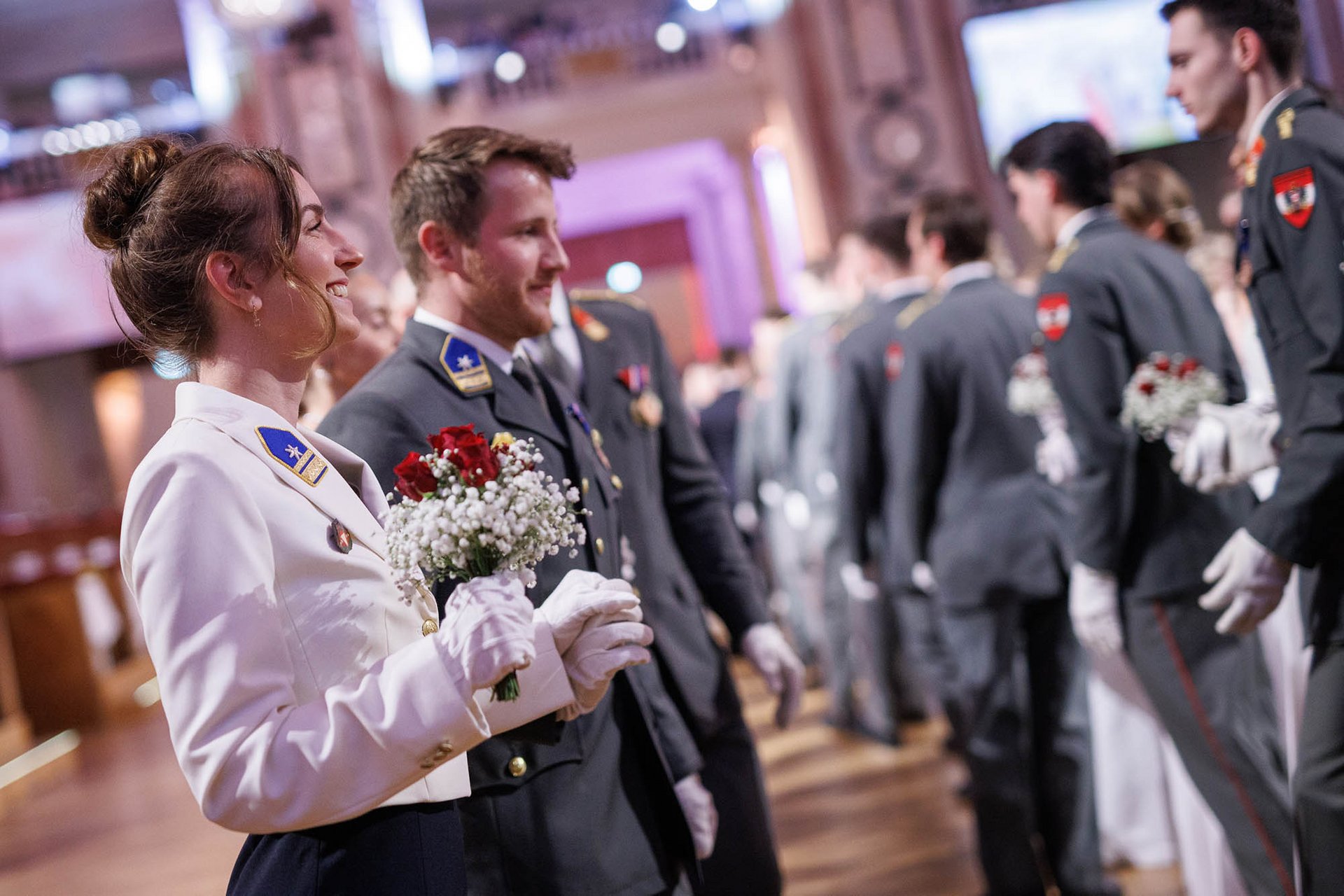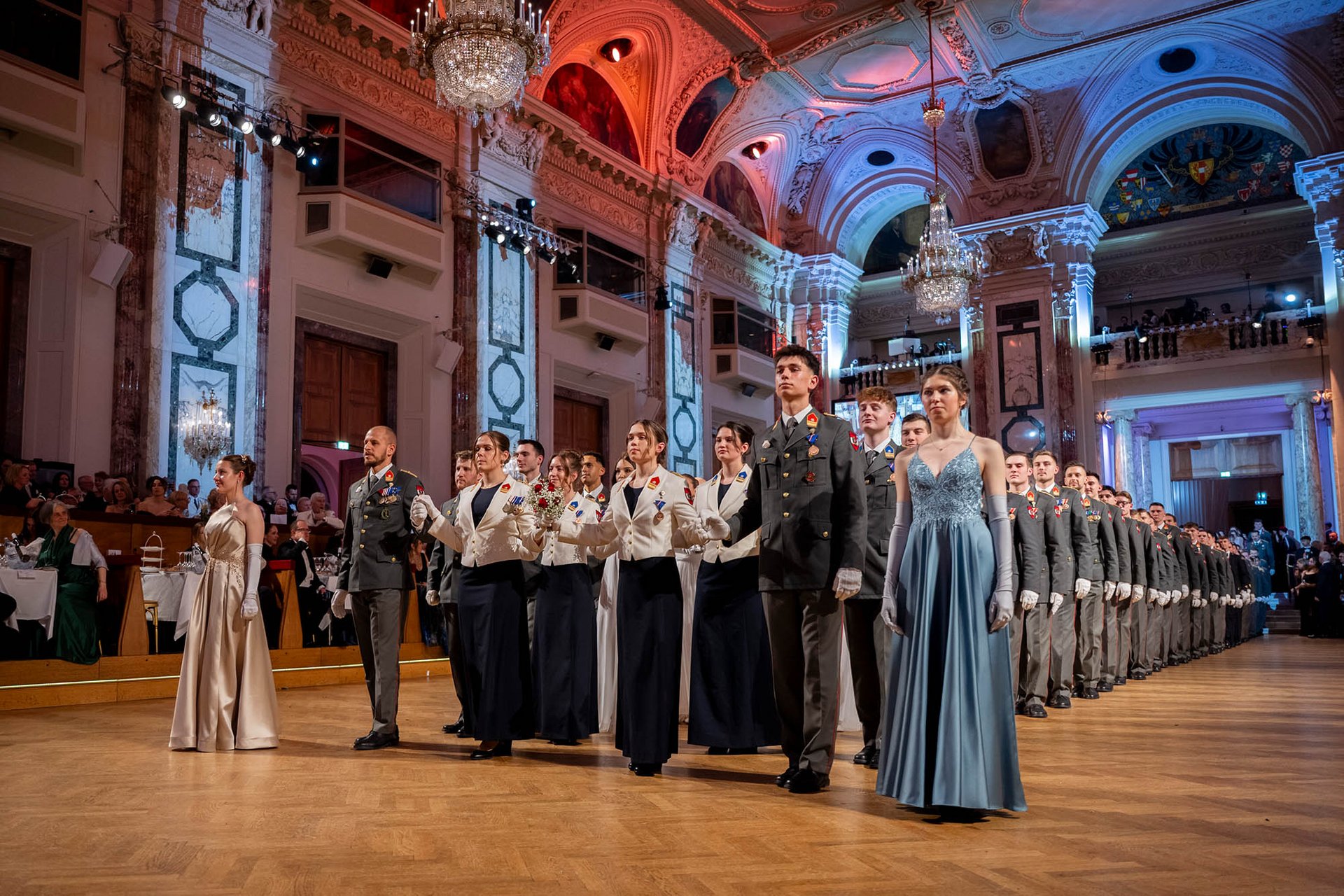 Die Militärakademiker des 1. Jahrganges, Kadetten der BHAK für Führung und Sicherheit angehende Militärärzte und Offiziersanwärter der italienischen Streitkräfte bildeten das Jungdamen- und Jungherrenkomitee für die Eröffnung, für deren Choreografie traditionell die Tanzschule Elmayer verantwortlich zeichnete.