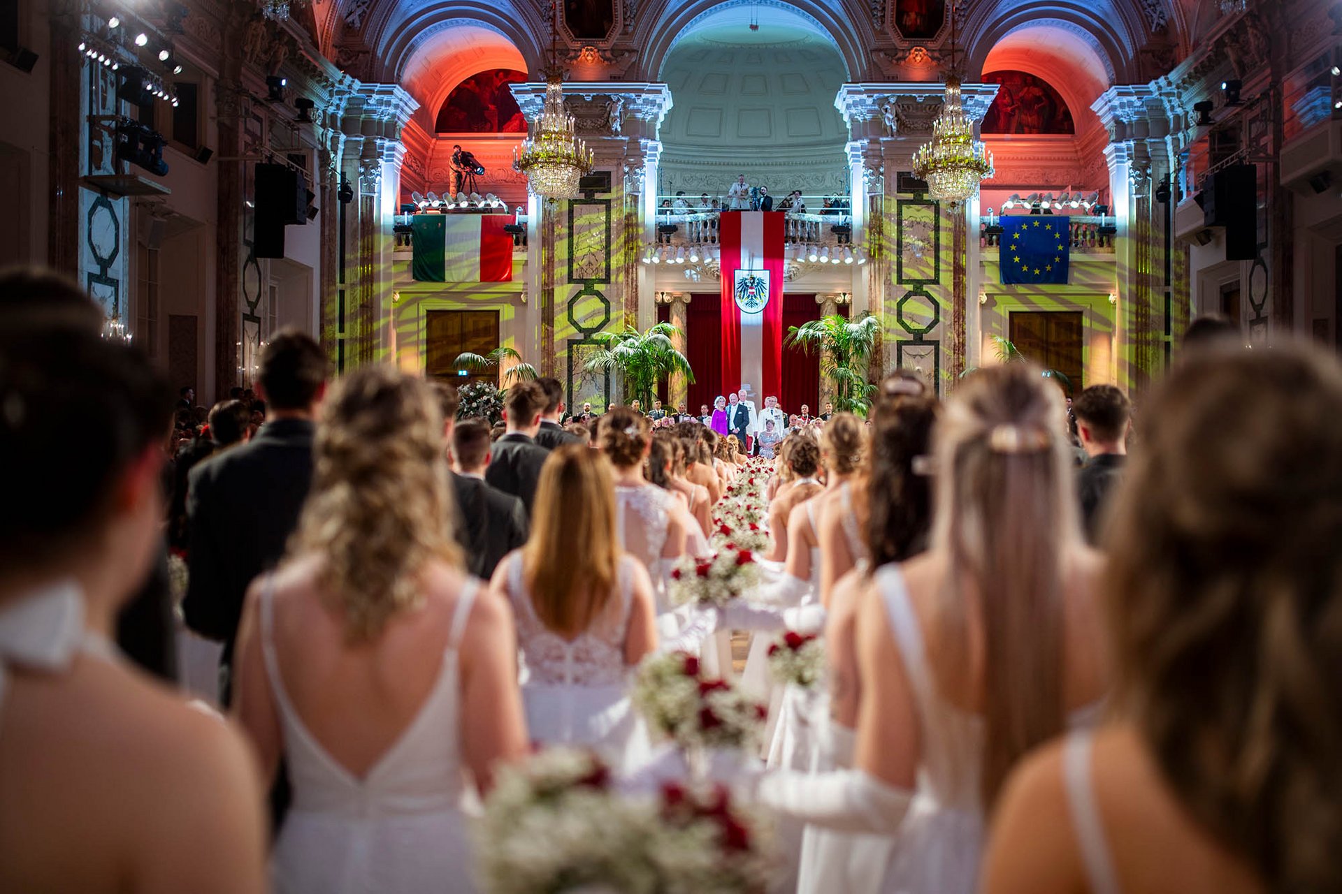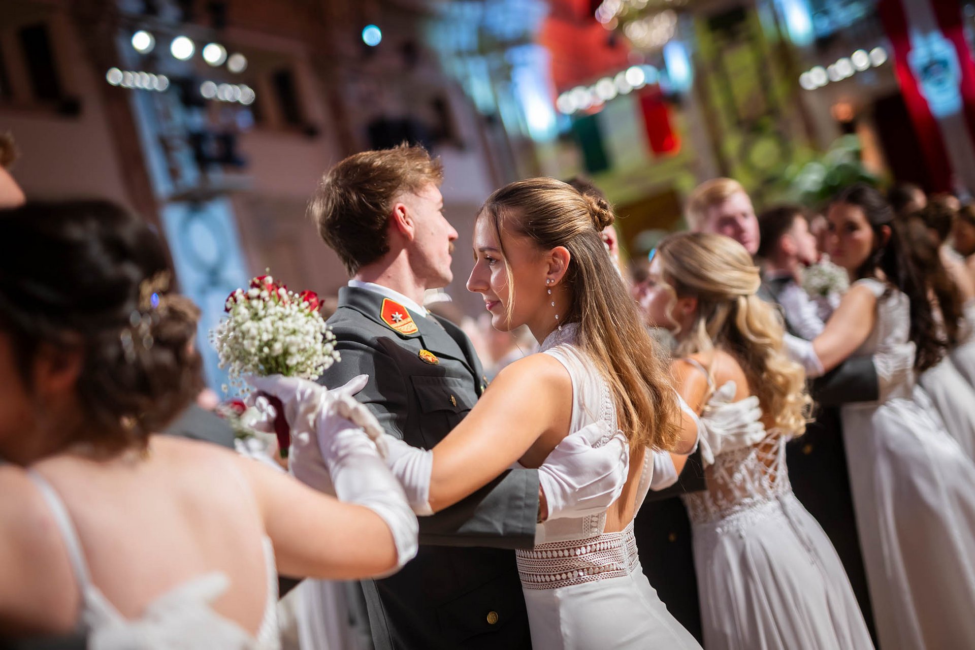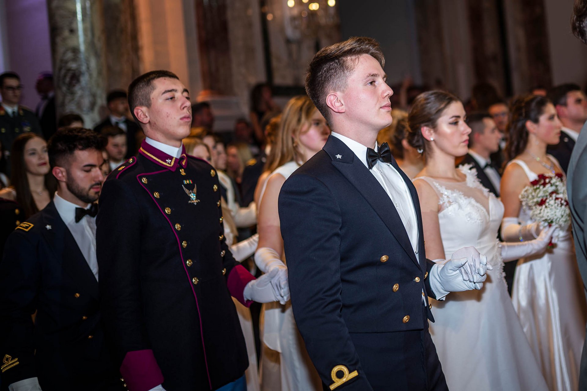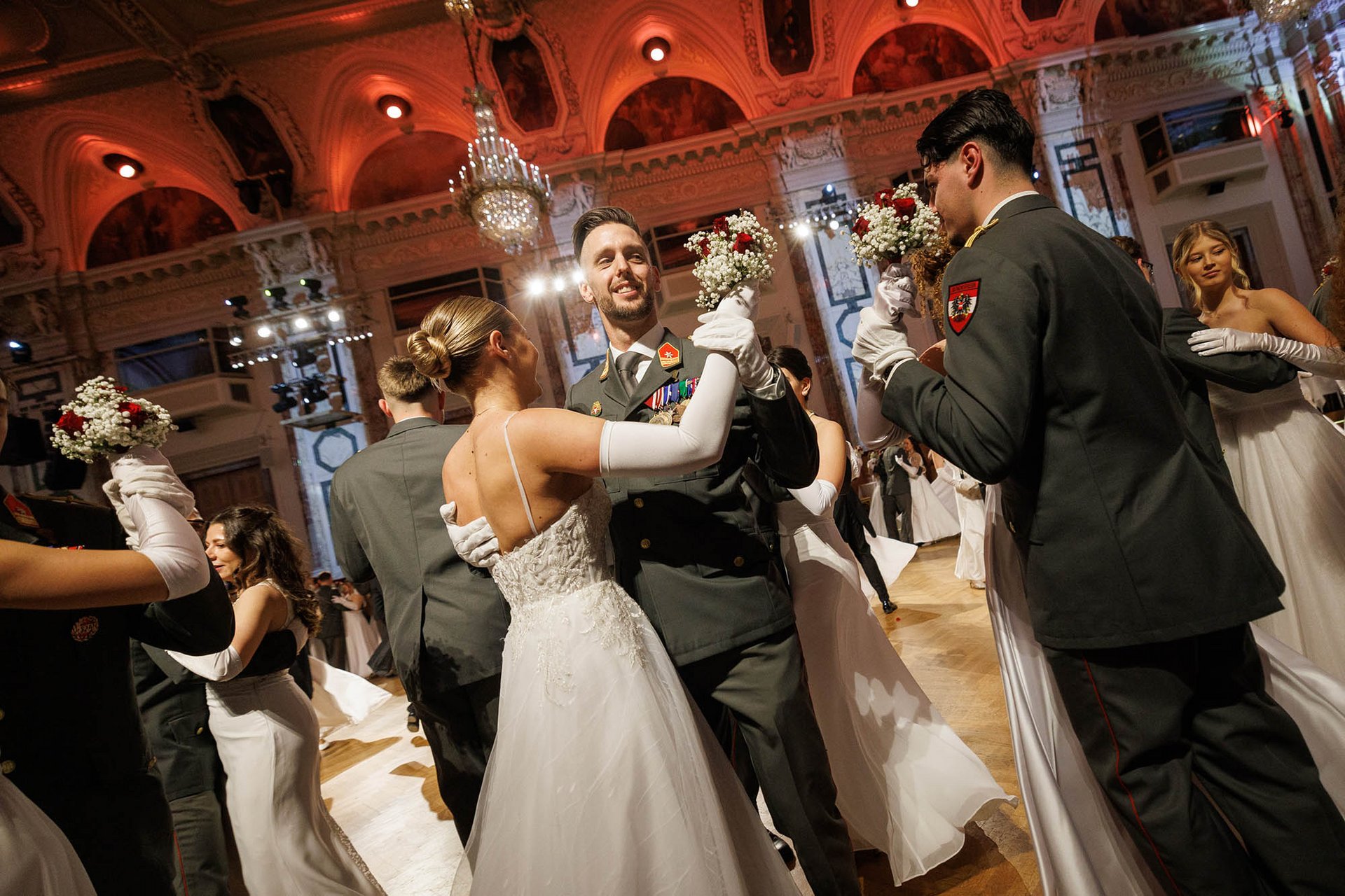 Die Militärakademiker des 1. Jahrganges, Kadetten der BHAK für Führung und Sicherheit angehende Militärärzte und Offiziersanwärter der italienischen Streitkräfte bildeten das Jungdamen- und Jungherrenkomitee für die Eröffnung, für deren Choreografie traditionell die Tanzschule Elmayer verantwortlich zeichnete.