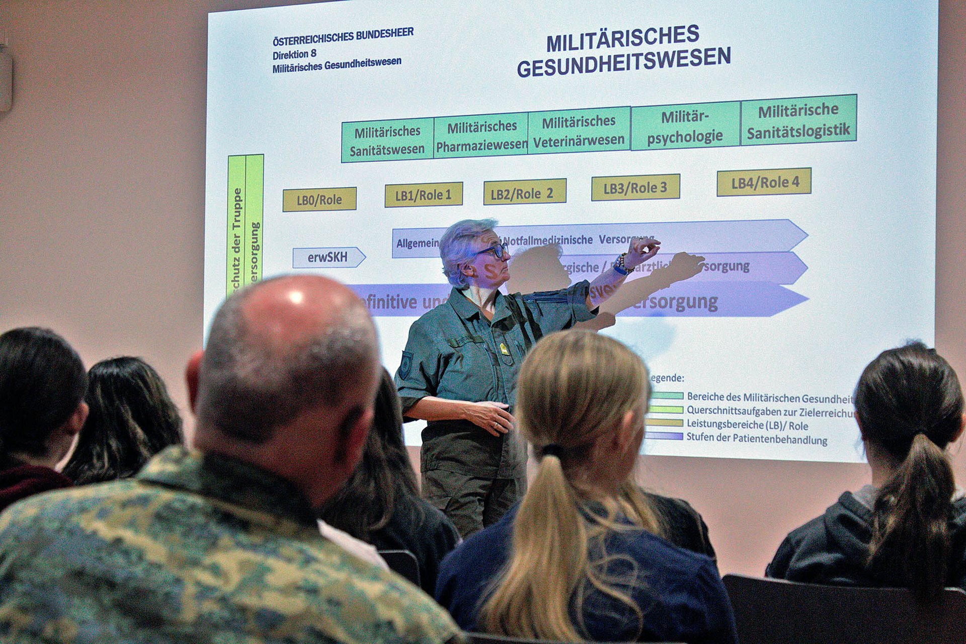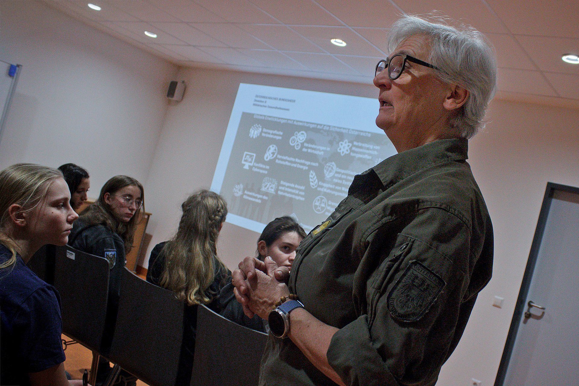 Auch der Zusammenhang zwischen Sicherheit und Gesundheit spielte eine wichtige Rolle. Ihre Aussage blieb besonders hängen: Ohne Sicherheit gibt es keine Gesundheit – und ohne Gesundheit keine Sicherheit. Anhand konkreter Beispiele erklärte sie medizinische Abläufe im militärischen Kontext und teilte Erfahrungen aus vielen Jahren Praxis, die für uns besonders wertvoll waren.