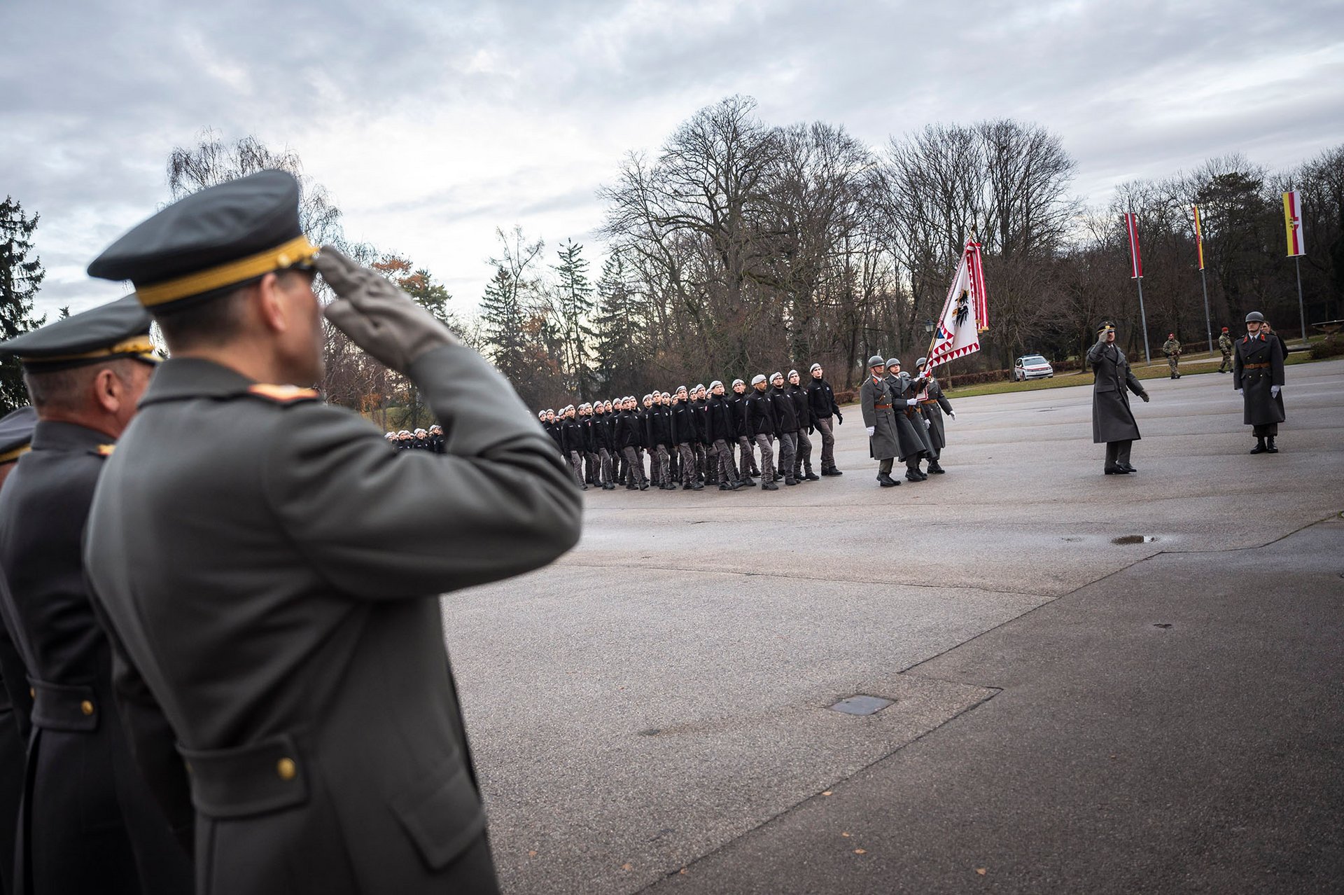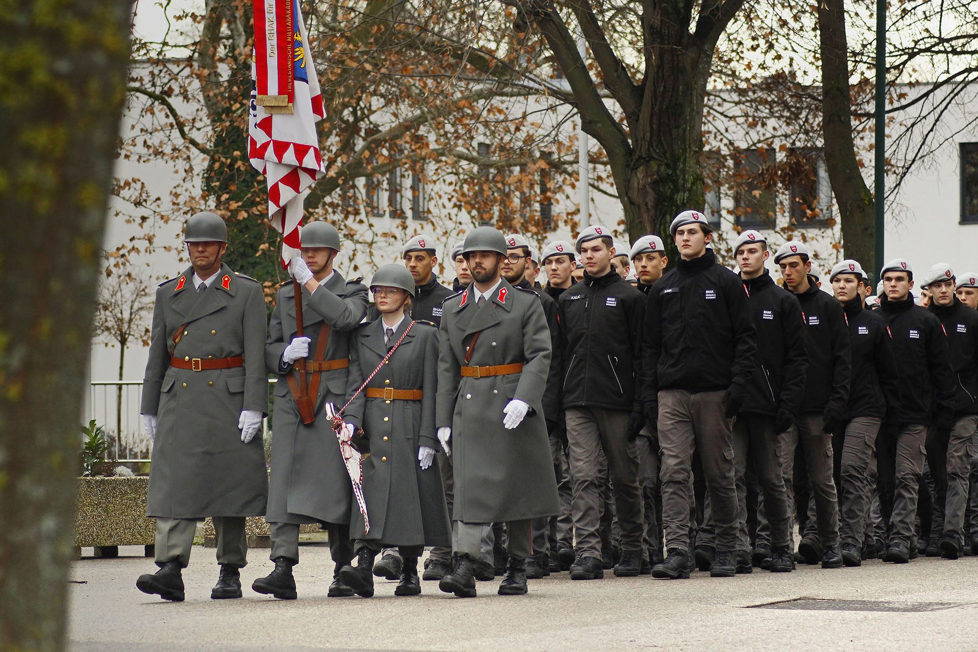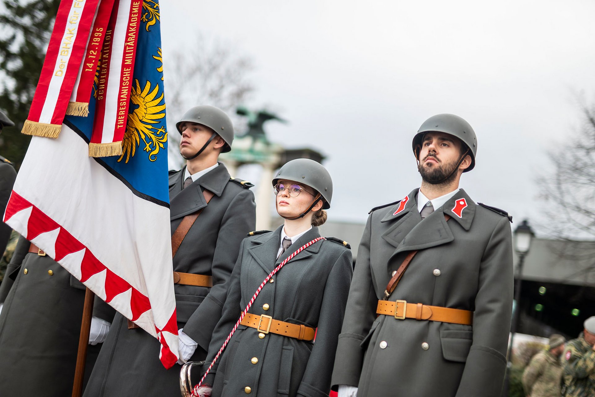 Nachdem alle Schul- und MilAk-Angehörigen vor der Daun-Kaserne angetreten waren, marschierten wir gemeinsam zum Maria-Theresien-Platz. Dort warteten schon zahlreiche Ehrengäste, wie die Familie von Herrn Generalmajor Pronhagl.