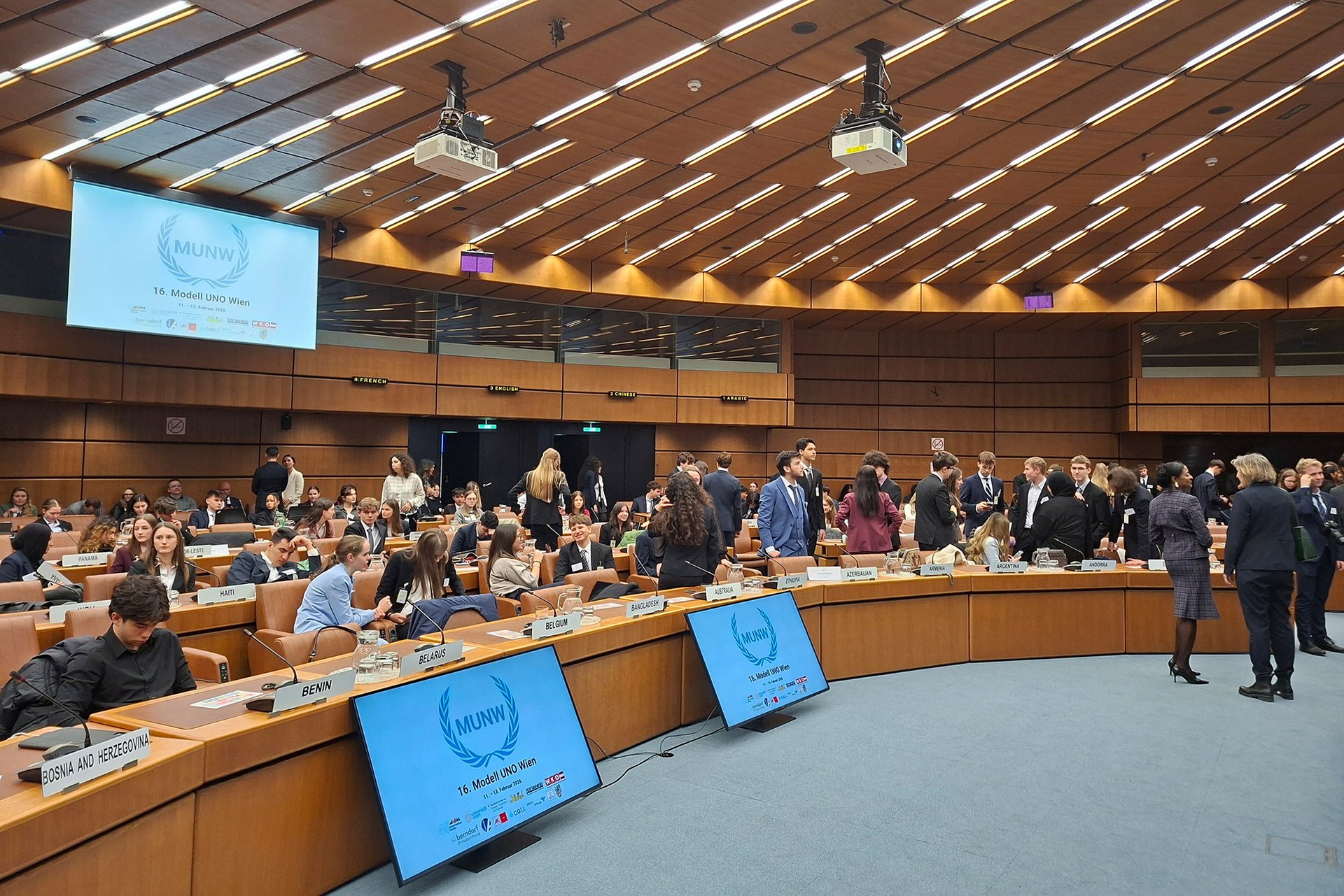 Sechs unserer Schüler besuchten von 11. bis 13. Februar 2026 die Modell UNO in Wien. Diese für Schüler der Oberstufen konzipierte Veranstaltung simuliert in einem Planspiel Verhandlungen der Vereinten Nationen und hat zum Ziel, die UNO und ihre Arbeitsweise kennen zu lernen, gemeinsam an Resolutionen zu arbeiten um damit die Standpunkte anderer Nationen besser verstehen zu können und das Verständnis für die Welt und ihre komplexen Zusammenhänge zu fördern.