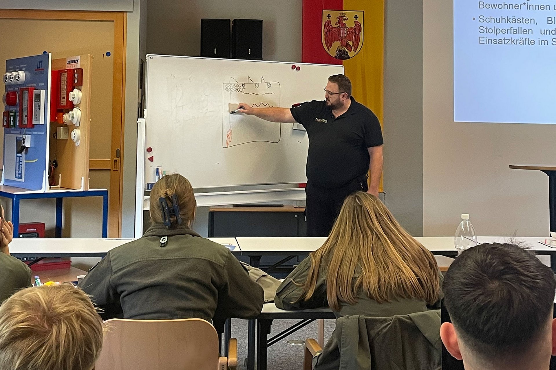 Weitere Unterrichtsinhalte des ersten Tages umfassten das Brand- und Tropfverhalten verschiedener Materialien sowie die drei Grundmaßnahmen im Brandfall.