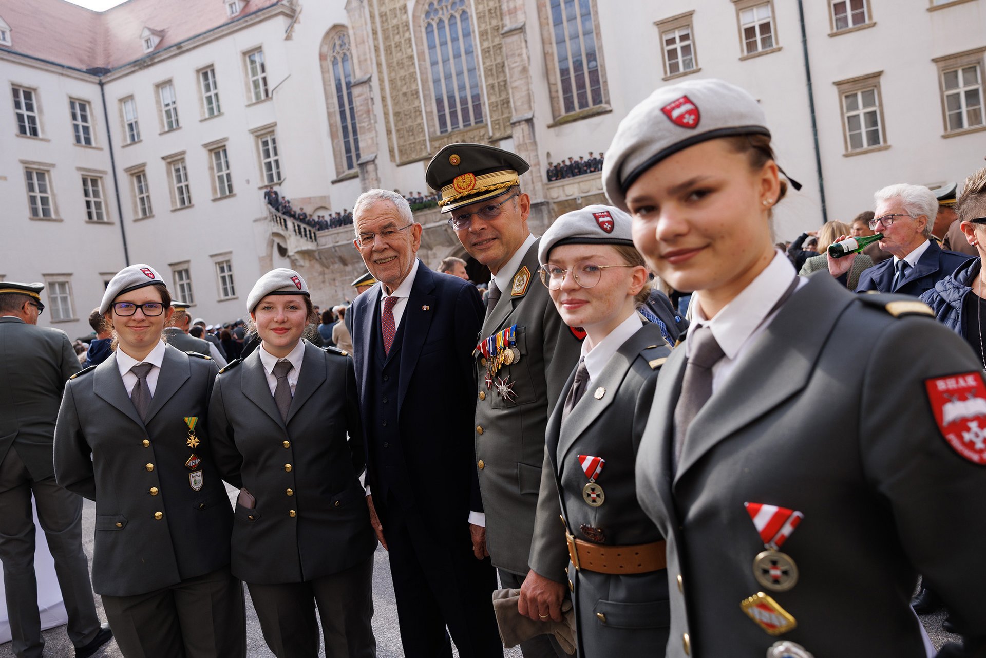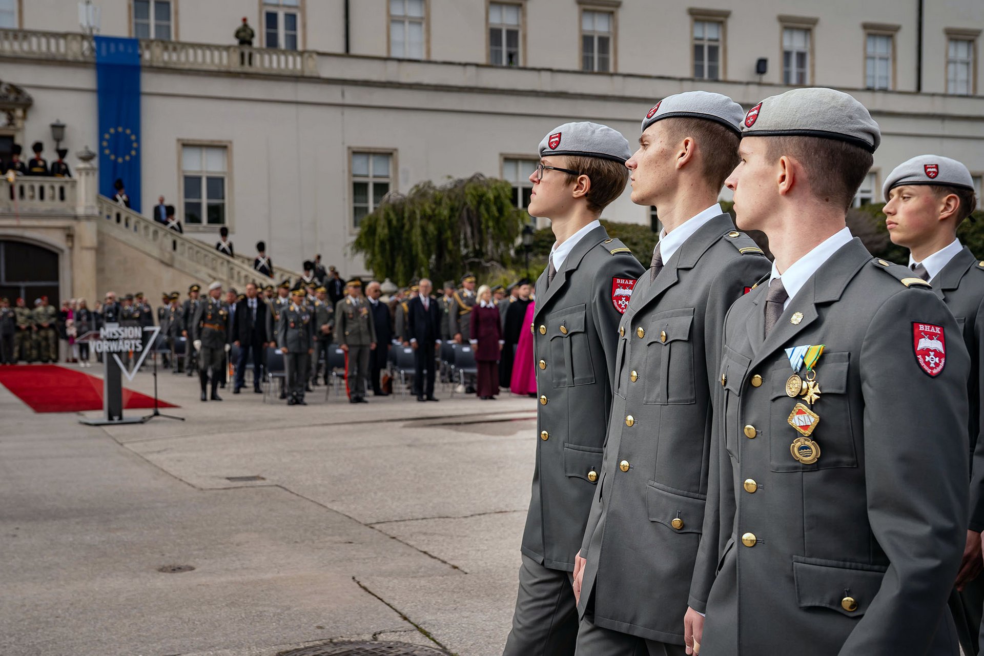 Für die Internatsschüler war bereits um 6 Uhr Tagwache. Anschließend mussten sich alle Kadetten die Krawatte zur festlichen Schulbekleidung binden, was für viele die erste Herausforderung des Tages war. Um 7 Uhr versammelten wir uns zum Antreten im Innenhof der Daunkaserne. Dort wurden uns die letzten Details zum Ablauf des Festaktes mitgeteilt. Anschließend übten wir gemeinsam mit den Fähnrichen und den Leutnanten bis um ca. 11 Uhr, um perfekt vorbereitet zu sein.
