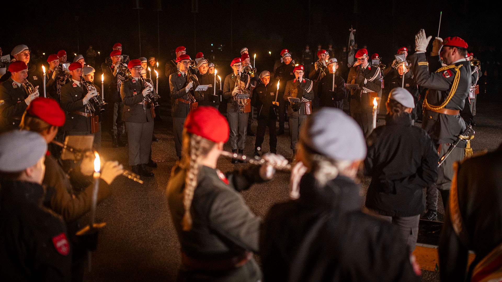Für uns der Höhepunkt des Abends war die Aufführung des “Großen Österreichischen Zapfenstreiches” durch die Gardemusik, bei dem unsere Kadetten der ersten Klassen als Fakelträger die Musiker unterstützten. Auch bei Regen ließen wir uns die Stimmung nicht verderben und genossen den stimmungsvollen Abend. Auch die Erklärungen zu diesem besonderen Musikstück erfolgten durch eine Schülerin der 5. Klasse.