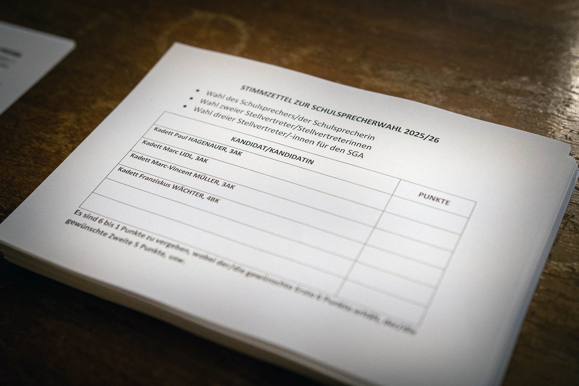Am Dienstag, dem 30. September 2025, fand unter der Leitung des Schuldirektors die Schulsprecherwahl für das Schuljahr 2025/2026 statt. Es galt den Schulsprecher, seine Stellvertreter und die Ersatzmitglieder für den Schulgemeinschaftsausschuss zu bestimmen.